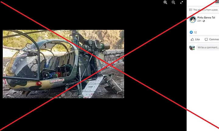 3 फरवरी, 2020 को जम्मू-कश्मीर के रियासी जिले में भारतीय सेना की चीता हेलीकॉप्टर क्रैश हुआ था. वायरल फोटो उसी क्षतिग्रस्त विमान की है. 2020 की मीडिया रिपोर्ट्स से हमें पता चला कि सेना का इस चीता विमान में हादसे के वक्त 2 पायलट थे, जो हादसे के बाद सही सलामत मिल गए थे.