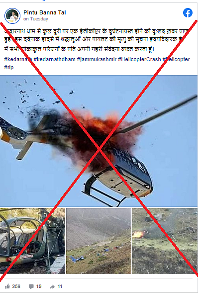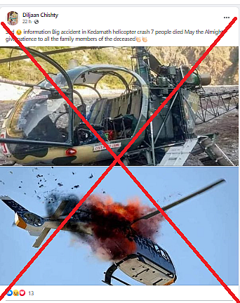 सोशल मीडिया पर अलग-अलग कैप्शंस के साथ ये फोटो केदारनाथ में हुए हादसे की बताकर शेयर हो रही है. Pintu Banna Tal नाम के यूजर ने तीन अन्य तस्वीरों के साथ ये फोटो शेयर की. इनमें से एक जलते हुए एयरक्राफ्ट की फोटो की पड़ताल क्विंट की वेबकूफ टीम पहले कर चुकी है. Diljaan Chishty नाम के एक अन्य यूजर ने भी दोनों तस्वीरों को साथ शेयर किया.